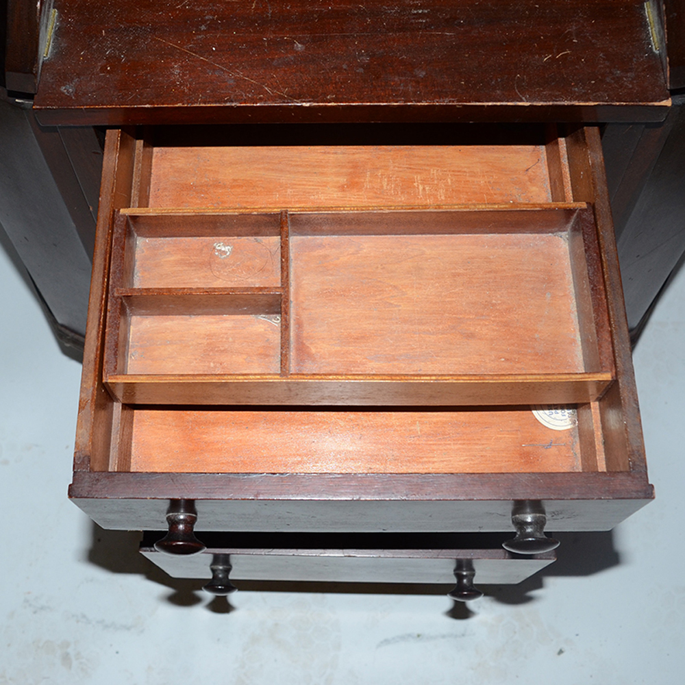 After struggling to get the old (1927) ones out these fit right in the holes! She liked to sew and knit, so the deep compartments were to store material and yarn! By the end of the 1940s the lightweight little box with the hinged lid was gone. details. It is mahogany, it should sell at $200.00 dollars. Probably from the depression era.